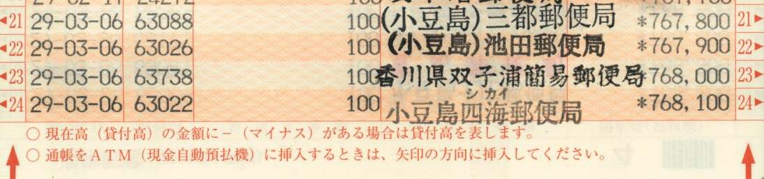 | 7691 | 14 | 内海 | 香川県小豆郡小豆島町 | ○ | 「うちのみ」 この一帯の集配をやっている郵便局 | |