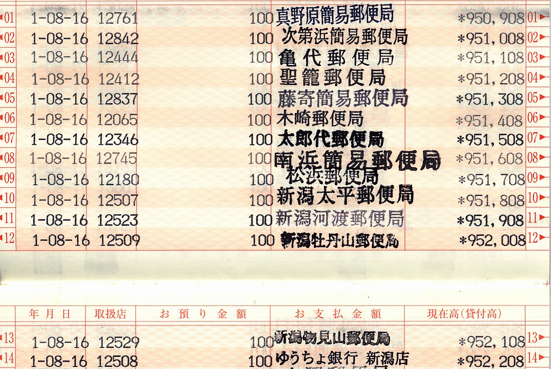 | 9515 | 37 | 新潟中央 (ゆうちょ銀行・新潟店) | 新潟県新潟市中央区 | ○ | 新潟県はなんども来てるのにここに来るのは初めて | |
